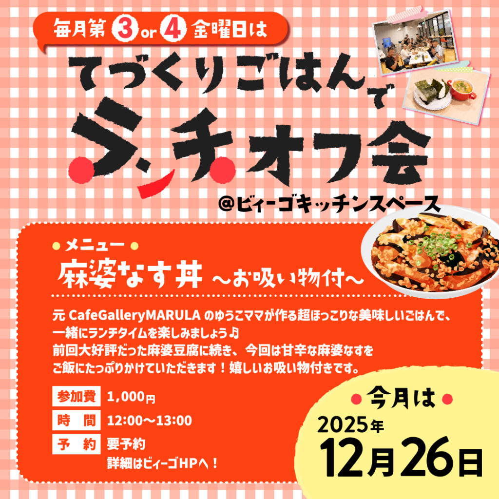 2025年12月26日 (金)12:00〜13:00 手作りごはんでランチオフ会「麻婆なす丼 お吸い物付き」 を開催します!どなたでも参加大歓迎です♪