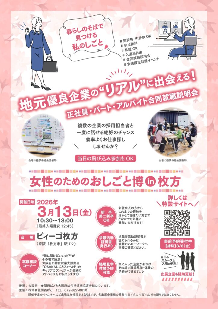 2026年3月13日 (金) 10:30〜13:00に、枚方ビオルネ5Fビィーゴのイベントルームにて、株式会社関西ぱど主催大阪府後援女性のためのおしごと博in枚方が開催されます!