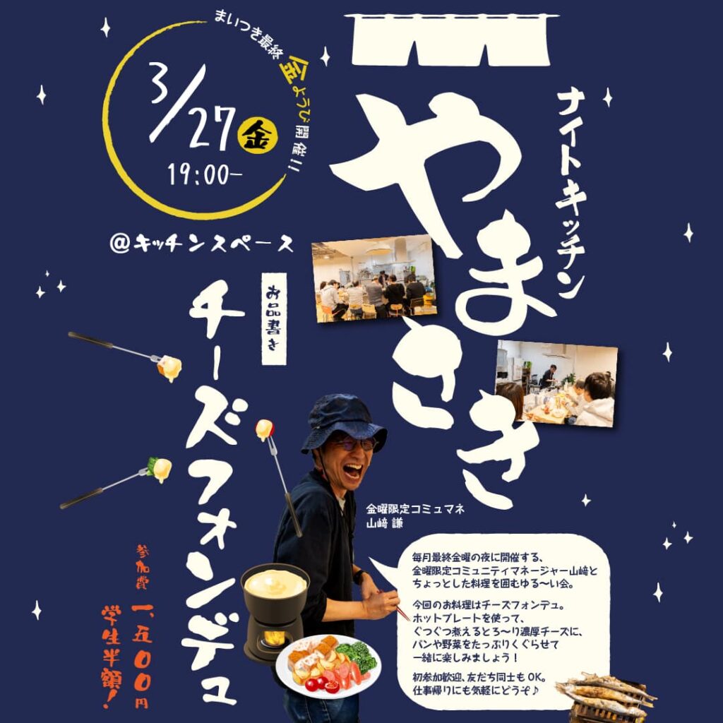 2026年3月27日(金)19:00〜21:00頃までナイトキッチンやまさき「チーズフォンデュ」を開催します。