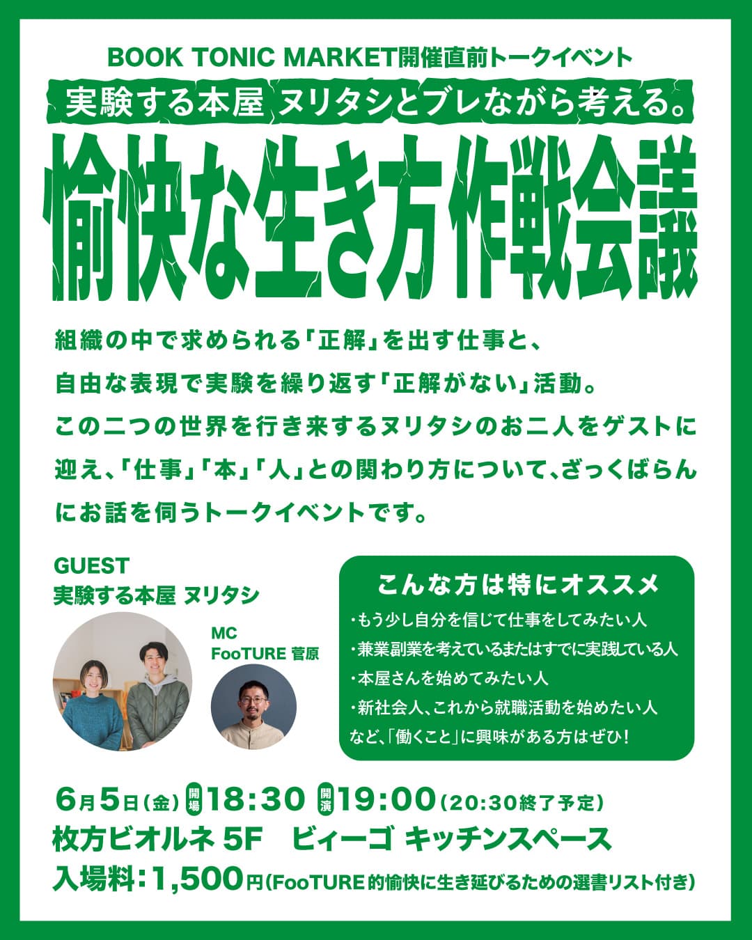 2026年6月5日 (金) 18:30〜20:30に、枚方ビオルネ5Fビィーゴのキッチンスペースにて、FooTURE主催「実験する本屋 ヌリタシと考える。愉快な生き方作戦会議」が開催されます!