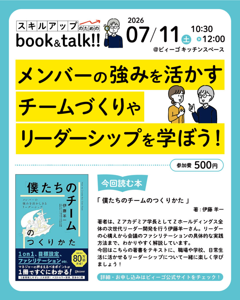 2026年7月11日 (土) 10:30〜12:00 枚方ビオルネ5Fビィーゴのキッチンスペース にて、ビィーゴ主催「スキルアップのためのビィーゴbook&talk!! Vol.4「メンバーの強みを活かす リーダーシップを学ぼう!」を開催します!