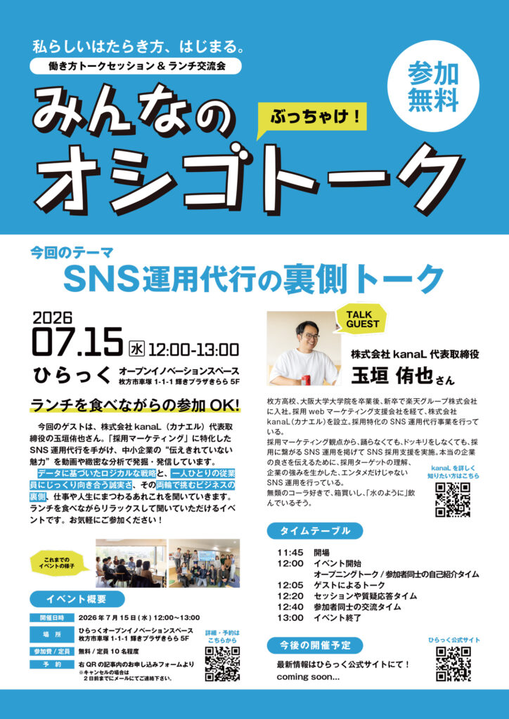 2026年7月15日(水) 12:00〜13:00に、ひらっくコワーキングスペースのオープンイノベーションスペースにて「みんなのオシゴトークinひらっくVol.7〜SNS運用代行の裏側トーク」を開催します。