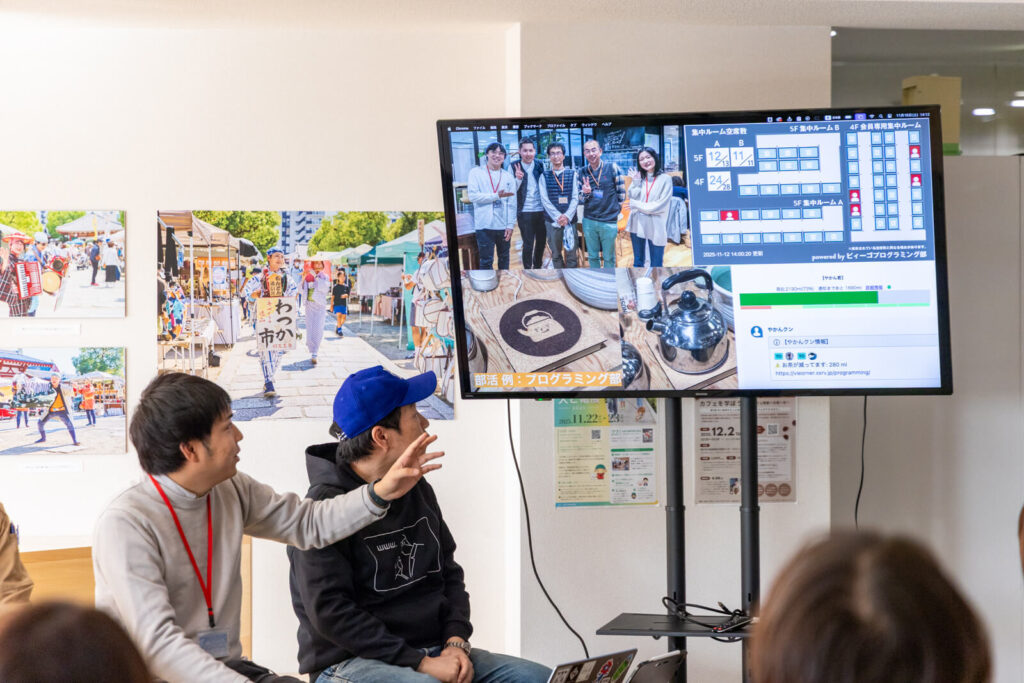 まずは、コミュニティー作りの取り組みについて。ビィーゴでは、現場からリタイアされた利用者さん同士でつながってプログラミング部を発足させた事例があります。コワーキング内の空き状況やお天気情報などをモニターに表示させるシステムを作るなど、ビィーゴのサービス向上に貢献してくださってます。