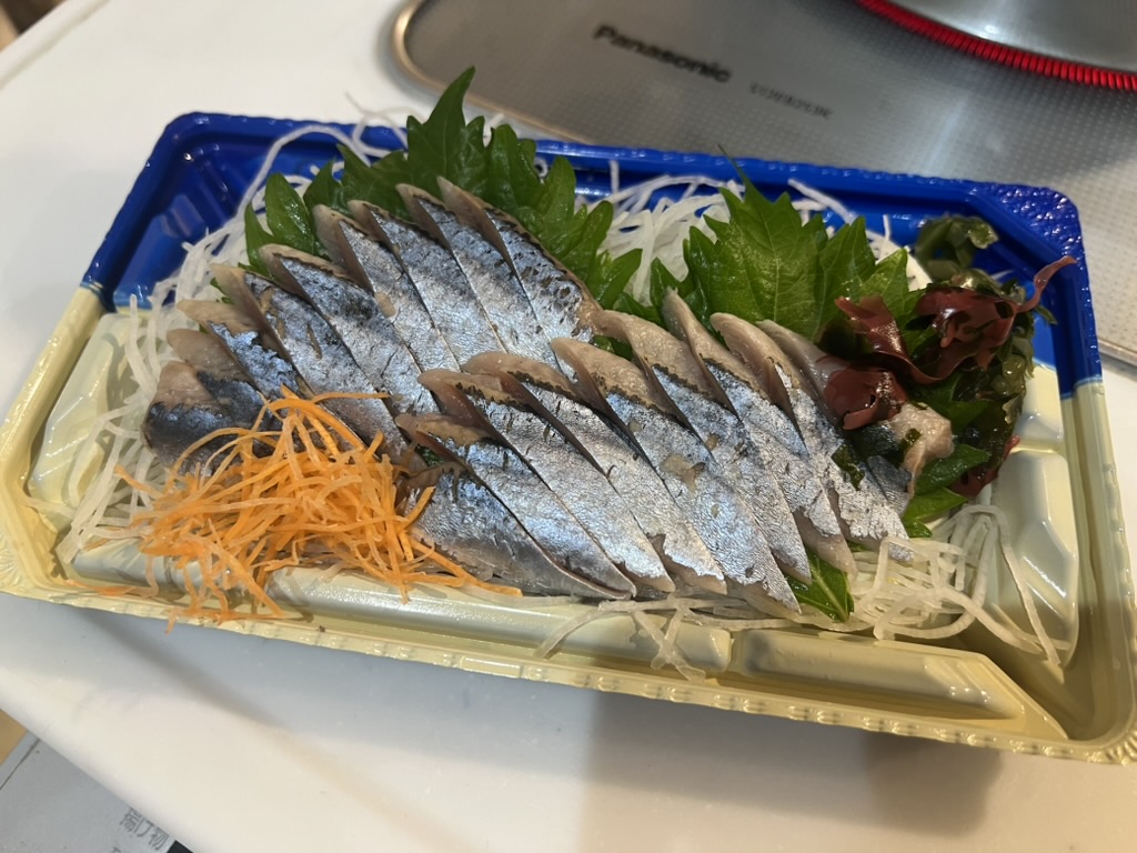 七輪があればよかったんですけど、さすがにそれは無理でフライパンで焼き、おさしみをいただくという形になりました。