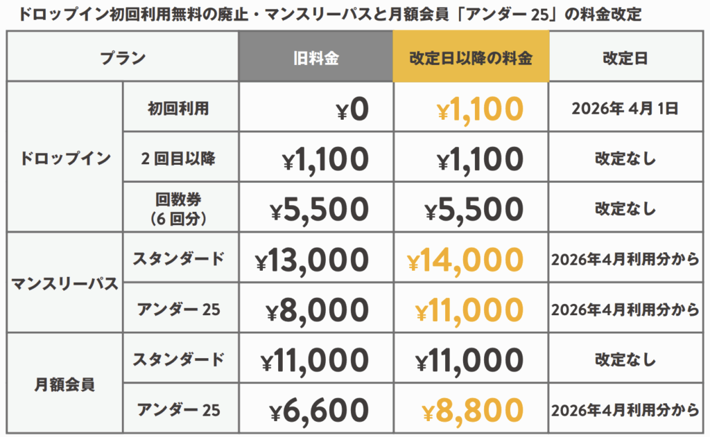 ※ドロップイン利用料金・ドロップイン回数券(ドロップイン6回分)の価格変更はございません。