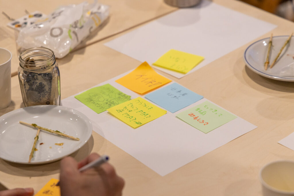 この日は中国雲南省の豆を使ったコーヒーとおだんごをいただきながら、それぞれがアイデアのたまごやこれから取り組みたいことを発表。それに対して参加者が思ったことを付箋に書きその人のところに貼っていきました。