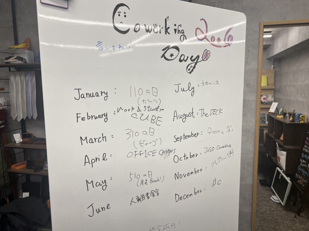 2024年にも行われた関西各所のコワーキングを巡る「コワーキングデイ」を2026年にもやろうと、会場にボードが用意されていたんですね。