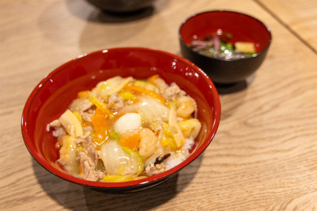 ごはん何杯でもいけそうなあんがかかった中華丼とお吸い物、そしてそれらをふわっと包みこんでくれる優しい飲み口の中国茶。ぜいたくな時間でした。