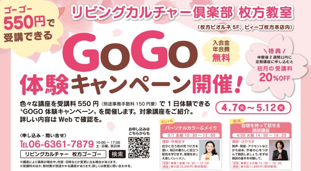その他【ビィーゴ】 リビングカルチャー俱楽部枚方教室「GoGo体験キャンペーン」(4/7〜5/12)