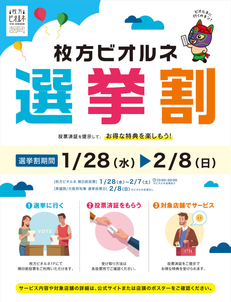 枚方ビオルネでは、2026年1月28日(水)~2月8日(日)まで『枚方ビオルネ選挙割』を開催いたします!