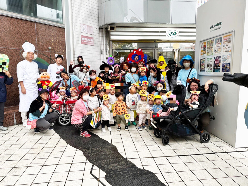 ビィーゴほいくえんの園児たちに、仮装したビオルネスタッフからお菓子をプレゼントしました。 園児たちは元気な声で、「トリックオアトリート」と言ってくれました♪ 子どもたちと一緒に記念撮影 -