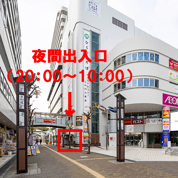※10:00~20:00以外の時間に利用される場合は、駐車場の階段で1階まで降りていただき、上記夜間出入り口から出入りをお願いいたします。