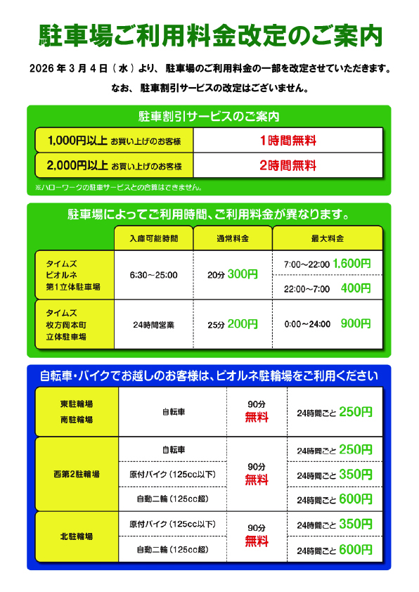 2026年3月4日より、タイムズ枚方岡本町立体駐車場のご利用料金を改定させていただきます。