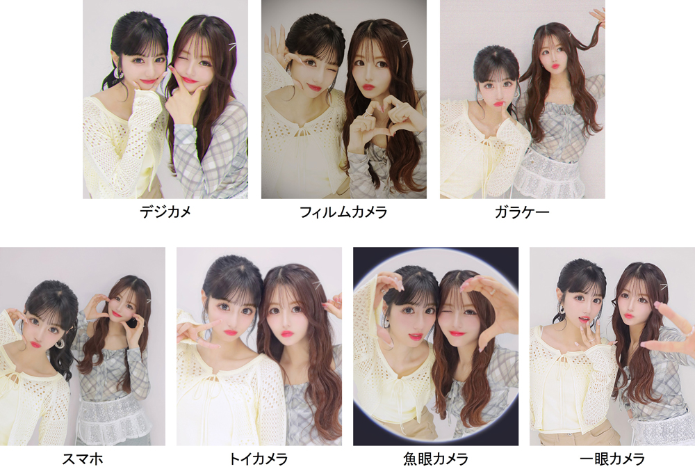 カメラ風フィルターには、デジカメ・フィルムカメラ・ガラケー・スマホ・トイカメラ・魚眼カメラ・一眼カメラの全7種類を搭載。好きなカメラ風フィルターを1つ選んで3枚撮影いただけます。選んだカメラ風フィルターに連動して撮影画面やシャッター音が変化し、まるでカメラを持ち込んでいるような体験ができるのも魅力です。