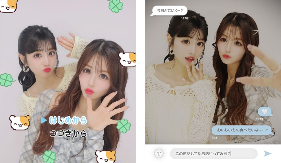 また、シールデザインにも選んだカメラ風フィルターと連動したデザインを搭載。定番のトレンドデザインも多数取り揃えているため、その日の気分に合わせて選ぶことができます。「YOUTH PHOTO撮影」のカメラ風フィルター、フレーム、カメラ風シールデザインを組み合わせることで世界観に統一感が生まれ、まるで選んだカメラを持って友達と出かけた日の何気ない瞬間を切り取ったような、青春感あふれる一枚に仕上がります。
